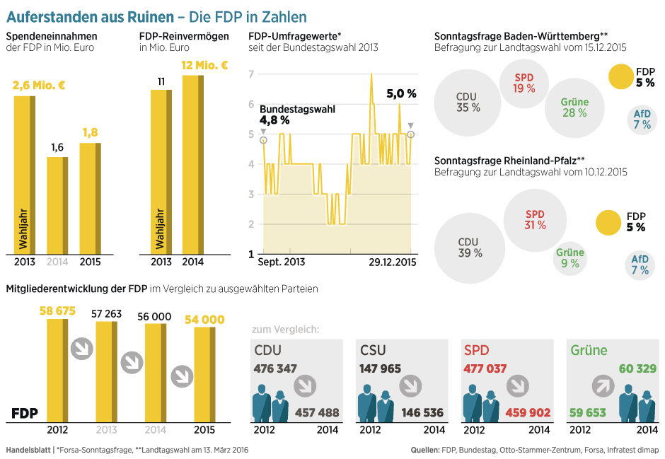 Lindner: Unsere Partei vollzieht einen Wandel. Im letzten Jahr haben sich fast 2 500 Bürgerinnen und Bürger uns angeschlossen – obwohl wir gerade nicht im Bundestag sind. Das sind echte Überzeugungstäter. Mit über 1,8 Millionen Euro haben wir außerdem 2015 ein exzellentes Spendenergebnis erzielt – den bisherigen Höchstwert in einem Jahr ohne Bundestagswahl aus 2014 nochmals überboten. Ich bin darauf stolz, weil es wachsenden Rückhalt zeigt. Wir brauchen keinen Goldhandel wie die AfD, mit dem die Käufer und der Staat regelrecht betrogen werden. Wir haben stattdessen viele Freunde marktwirtschaftlicher Politik, die sich zu uns öffentlich bekennen und uns mit Spenden unterschiedlichster Höhe helfen, professionell Kampagnen zu führen