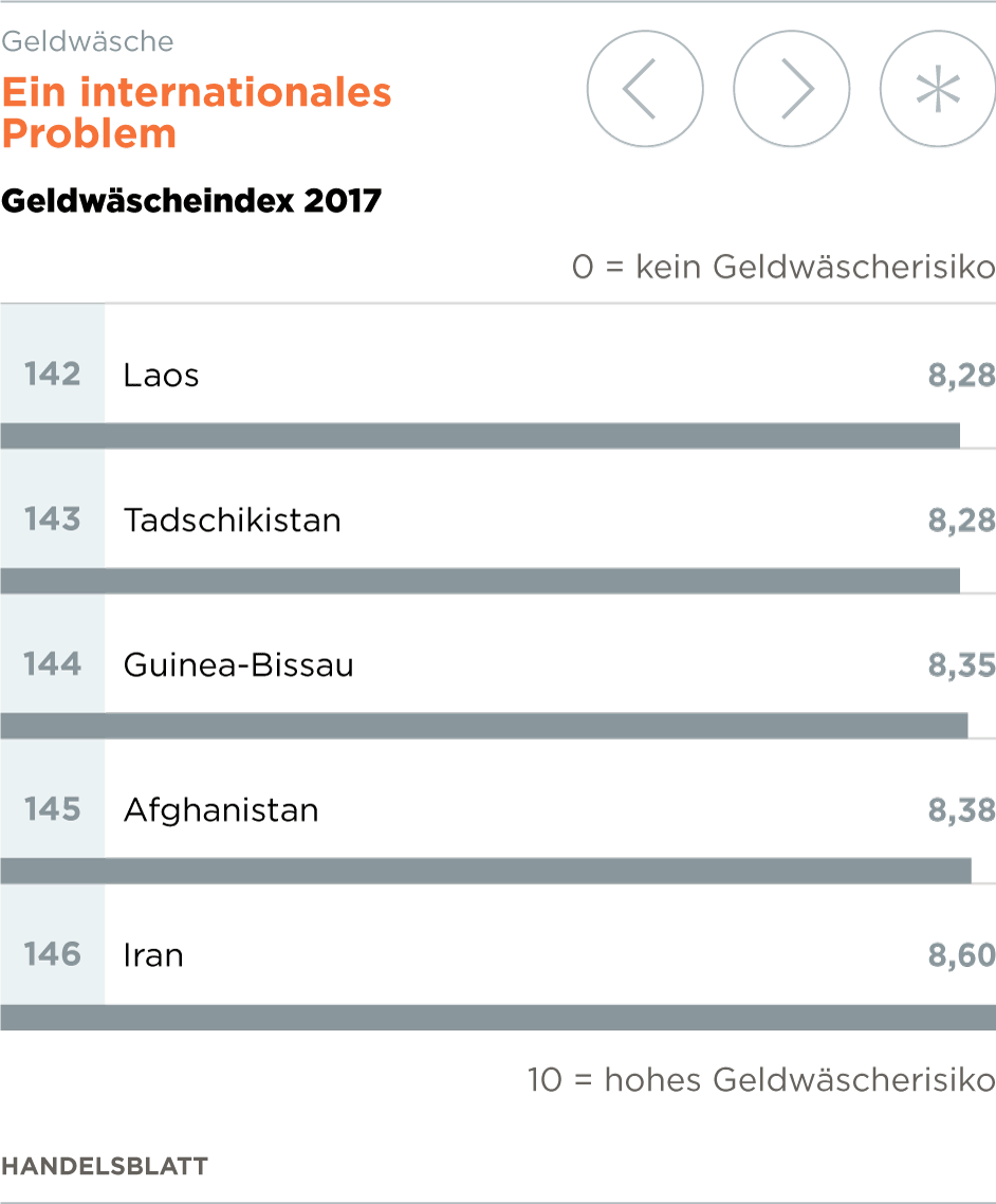 Der Anti-Money-Laundering (AML)-Index des Basel Institute on Governance untersucht die Anfälligkeit der betrachteten Länder für Geldwäsche und Terrorismusfinanzierung. In diesem Index belegt Deutschland einen Platz im Mittelfeld, weit entfernt vom Geldwäscheparadies Iran. Aber eben auch noch 25 Plätze entfernt von Finnland, jenem Staat, der dem Ranking zufolge weltweit am unattraktivsten für Geldwäscher ist. Selbst Malta schneidet im Ranking besser ab als die Bundesrepublik.