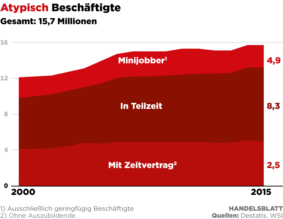 Schulz hat aber nicht allein die Zeitverträge im Blick, sondern auch Teilzeitbeschäftigte, Leiharbeiter oder Minijobber. Der SPD-Kanzlerkandidat beklagt, dass diese „atypischen“ Jobs stark zugenommen haben. Tatsächlich hat die Zahl seit Inkrafttreten der ersten Hartz-Reformen 2003 von 6,2 auf zuletzt 7,5 Millionen zugelegt. Ungleich stärker gewachsen ist aber die Zahl der Vollzeitjobs. Der Anteil der „atypisch“ Beschäftigten an allen Erwerbsfähigen lag 2015 bei 14 Prozent und damit auf dem Niveau des Jahres 2006. Der Anteil der „Normalarbeitsverhältnisse“ ist dank des Jobwunders im selben Zeitraum aber von 40 auf 47 Prozent gestiegen. Die Zahl der Zeitarbeiter hat jüngst zwar die Millionengrenze überschritten, gemessen an allen Arbeitnehmern ist der Anteil aber immer noch sehr klein.