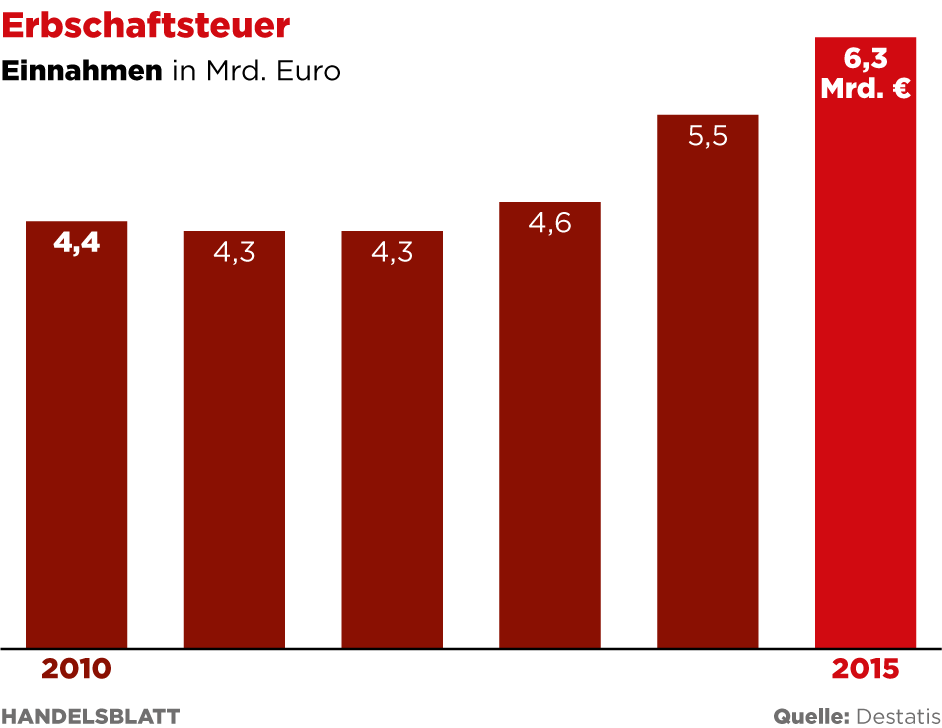Auch Erben werden geschont. Für Ehepartner oder Kinder gibt es großzügige Freibeträge, damit „Oma ihr klein Häuschen“ steuerfrei bleibt. Betriebserben werden nach der Reform 2016 zwar stärker vom Fiskus geprüft. Aber wenn sie bestimmte Bedingungen erfüllen, etwa die Zahl der Beschäftigten konstant halten, müssen auch Firmenerben in der Regel keine Steuern zahlen. Deshalb wird die Reform die Einnahmen aus der Erbschaftsteuer von rund 6,3 Milliarden Euro im Jahr auch nur um wenige Hundert Millionen steigern.