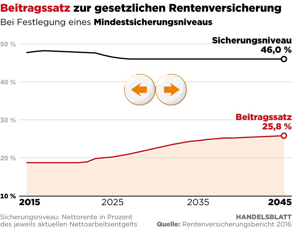 Seither ist das Rentenniveau eines Versicherten, der 45 Jahre lang immer vom Durchschnittslohn Beiträge gezahlt hat, von 53 Prozent auf aktuell 48 Prozent des durchschnittlichen Nettolohns vor Steuern gesunken. Ohne den Boom am Arbeitsmarkt wäre es noch niedriger. Bleibt es beim geltenden Recht, würde das Niveau bis 2045 nach Modellrechnungen der Rentenversicherung auf 41,7 Prozent schrumpfen. Der Beitragssatz stiege von 18,7 Prozent auf 25,8 Prozent. Das derzeit im Sozialgesetzbuch festgelegte Mindestniveau von 43 Prozent würde genauso unterschritten, wie der festgelegte Höchstbeitrag von 22 Prozent überschritten würde.