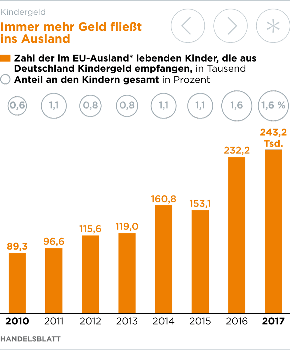 Wie das Bundesfinanzministerium mitteilt, wurde im Juni 2018 für 268.336 Kinder, die außerhalb von Deutschland in der Europäischen Union oder im Europäischen Wirtschaftsraum leben, Kindergeld gezahlt. Im Juni des vergangenen Jahres lag die Zahl noch bei 250.360 Kindern. Die Bundesagentur für Arbeit (BA) überwies 2017 rund 343 Millionen Euro Kindergeld an Konten im Ausland, das ist fast zehnmal so viel wie 2010.