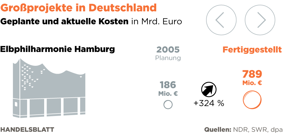 Seitdem hat sich nicht viel getan. Ob das umstrittene Bahnhofsprojekt Stuttgart 21, der neue Berliner Hauptstadtflughafen, die Elbvertiefung, Umgehungsstraßen, Autobahnen, Stromtrassen oder die verzögerte Eröffnung der Hamburger Elbphilharmonie: Großprojekte in Deutschland stehen immer wieder wegen Zeitverzögerungen und massiv steigenden Kosten in der Kritik. Stuttgart 21 soll nun erst Ende 2024 und damit abermals 12 Monate später fertig werden – und außerdem viel mehr kosten als geplant. Der Berliner Flughafen wehrte sich erst vergangene Woche gegen Vorwürfe, neue Pannen führten wohl zu weiteren Verzögerungen auf der Baustelle. Mitte Dezember will Flughafen-Chef Engelbert Lütke Daldrup dem Aufsichtsrat einen neuen Starttermin nennen. Ursprünglich sollte der Airport 2012 in Betrieb genommen werden.