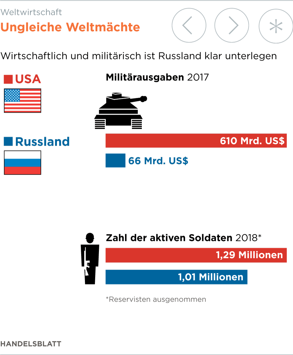 Für den Kreml ist allein das ein machtpolitischer Coup. Putin begegnet Trump auf Augenhöhe, obwohl Russland den USA militärisch und wirtschaftlich weit unterlegen ist und die Spannungen zwischen beiden Mächten das Niveau des Kalten Kriegs erreicht haben. Trump schenkt Putin die Anerkennung, nach der er so sehr verlangt, ohne dass die Russen in Vorleistung gehen müssten.