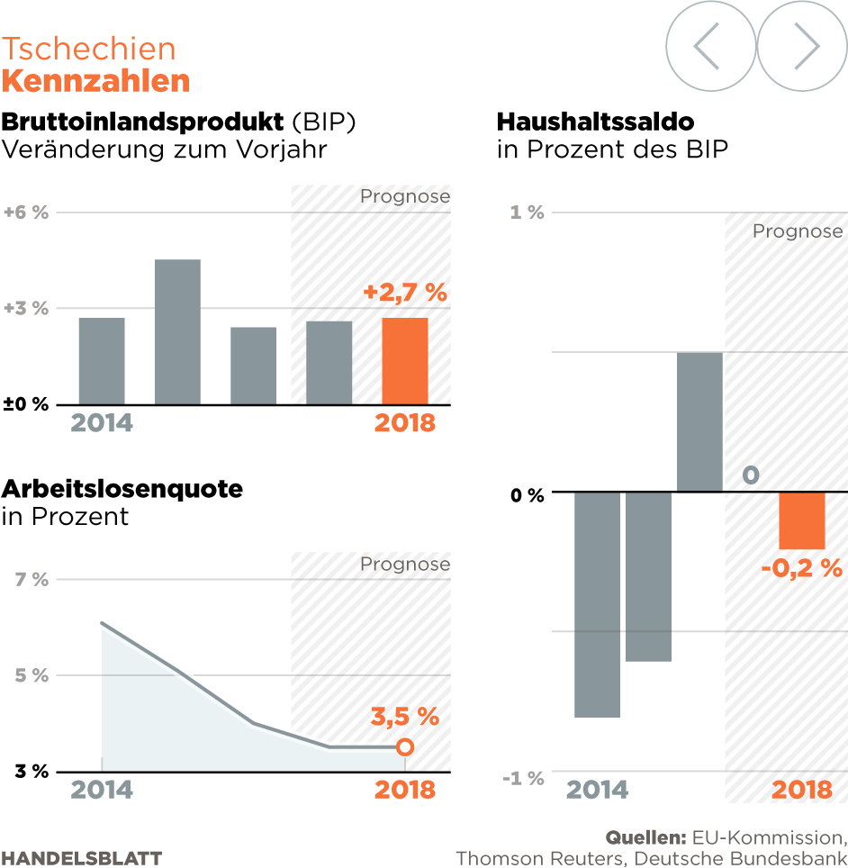 Die drohende politische Instabilität ist ein Paradoxon. Denn ökonomisch geht es dem Land prächtig. Nach einer Prognose der österreichischen Erste Group wächst die tschechische Wirtschaft in diesem Jahr um 2,9 Prozent und 2018 um 2,8 Prozent. Die in Tschechien aktive Raiffeisen Bank International rechnet mit 2,3 Prozent und für 2018 mit 2,7 Prozent. Im Land herrscht mit einer Arbeitslosenquote von nur noch 3,6 Prozent – die niedrigste unter den 28 EU-Mitgliedstaaten – quasi Vollbeschäftigung. „In Prag ist der Arbeitsmarkt leer gefegt“, berichtet Bernard Bauer, geschäftsführender Vorstand der Deutsch-Tschechischen Industrie- und Handelskammer.