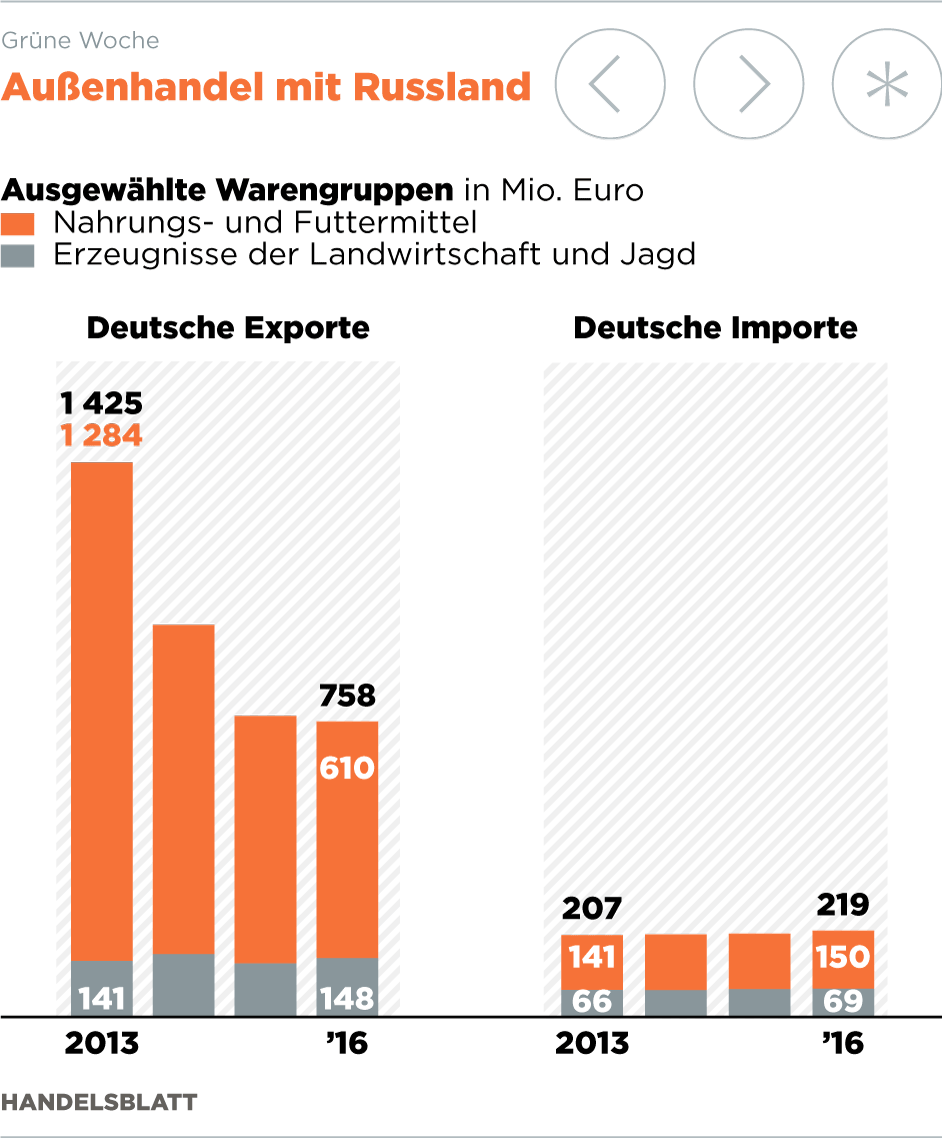 Schmidt hat das Riesenreich nach zwei Jahren Pause wegen der Russland-Sanktionen aufgrund der russischen Annexion der ukrainischen Halbinsel Krim wieder als Aussteller auf die Agrarmesse gelotst. Dazu hatte er im Rahmen der deutschen G20-Präsidentschaft voriges Jahr seinen russischen Amtskollegen Alexander Tkatschow nach Deutschland eingeladen – obwohl Brüssel gegen ihn ein Einreiseverbot verhängt hat. Bis 2015 war Russland das größte Ausstellerland auf dieser Berliner Messe, dann war zwei Jahre Funkstille.