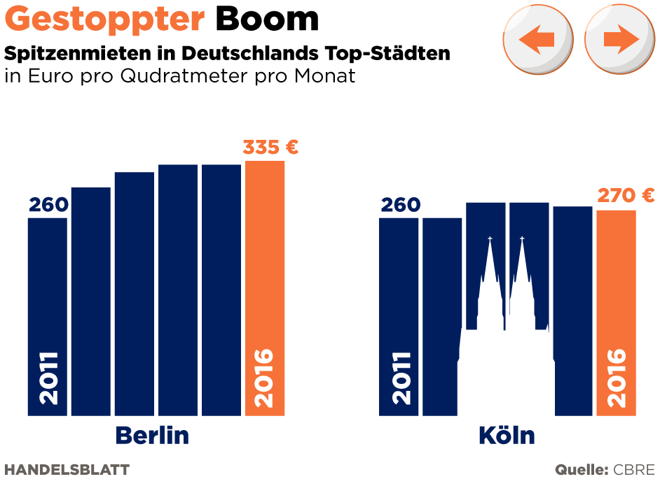Die Zahlen von CBRE, die dem Handelsblatt exklusiv vorliegen, zeigen: Die Spitzenmieten haben sich in den sechs teuersten deutschen Metropolen in den vergangenen Jahren auf einem hohen Niveau stabilisiert. Nur Berlin konnte 2016 leicht von 330 auf 335 Euro pro Quadratmeter und Monat zulegen. In Köln sind die Spitzenmieten sogar von 280 auf 270 Euro zurückgegangen.