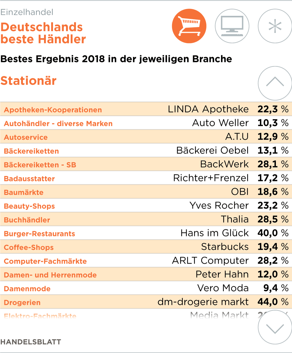 Belohnt wird solche Liebe zum Detail mit einem zehnten Platz beim stationären Geschäft und sogar einem fünften im Onlinehandel. Ähnlich ist es bei der Parfümerie Douglas mit einem siebten und einem neunten Platz.