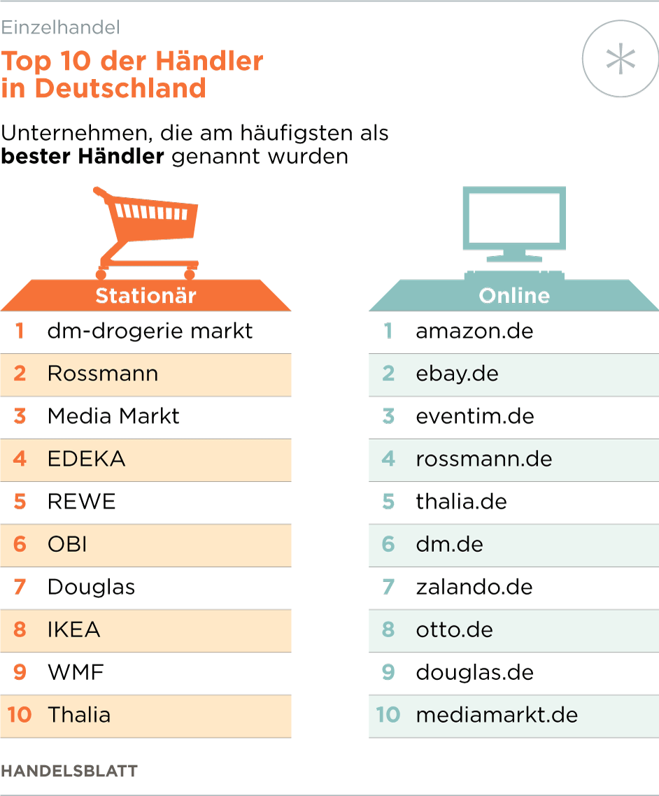 Ganz vorne in der Rangliste der besten stationären Händler liegen die beiden Drogerieketten dm und Rossmann. In einem engen Zweikampf um die Vorherrschaft in der Branche überbieten sie sich geradezu in Serviceleistungen für die Kunden. Das färbt auch auf den E-Commerce ab. Bei den Onlinehändlern liegen sie in der Gunst der Kunden auf Platz vier und sechs.