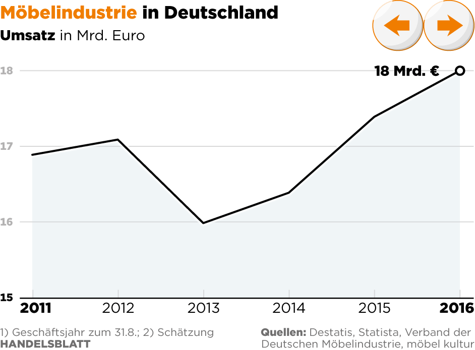 2016 war ein Rekordjahr für die deutsche Möbelindustrie. Die Hersteller rechnen damit, dass sie das erste Mal die Umsatzgrenze von 18 Milliarden Euro geknackt haben – bei einem Wachstum von 3,5 Prozent. Es ist das dritte Jahr in Folge, dass die Möbelindustrie wächst. Klaas scherzte deshalb auf der Trend- und Wirtschaftskonferenz vor Beginn der Kölner Möbelmesse: „Wir haben das Triple geschafft.“