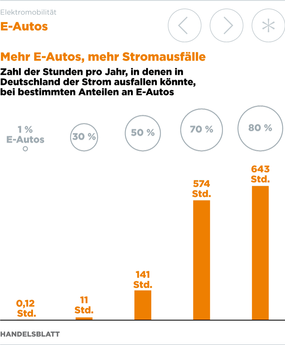 Wie groß der Handlungsbedarf ist, hat die Unternehmensberatung Oliver Wyman gemeinsam mit der TU München untersucht. „Bereits ab einer E-Auto-Quote von 30 Prozent wird es ohne Gegenmaßnahmen zu flächendeckenden Stromausfällen kommen“, heißt es in einer bisher unveröffentlichten Studie, die dem Handelsblatt vorliegt. Schlimmer noch: „Punktuell werden schon in den kommenden fünf bis zehn Jahren Versorgungsengpässe entstehen, etwa in suburbanen Gebieten mit einer höheren Affinität zur Elektromobilität.“