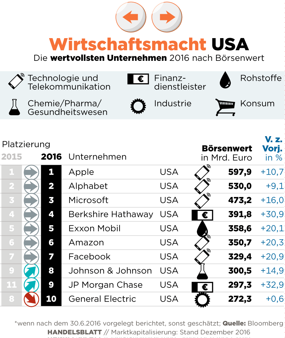 Foto: HandelsblattWenn Donald Trump im Januar als Präsident der USA vereidigt wird, kann er sich auf die Wirtschaftskraft seines Landes verlassen. Sein Wahlversprechen „America first“ hat die Wall Street schon verinnerlicht. Die Handelsblatt-Rangliste der, gemessen an der Börsenkapitalisierung, weltweit wertvollsten Unternehmen zeigt: 58 der 100 größten Firmen kommen aus den USA. Die Top 13 stammen sogar allesamt aus Amerika – eine Demonstration mikroökonomischer Stärke, die es in dieser Ausprägung in der Börsengeschichte so noch nicht gegeben hat.