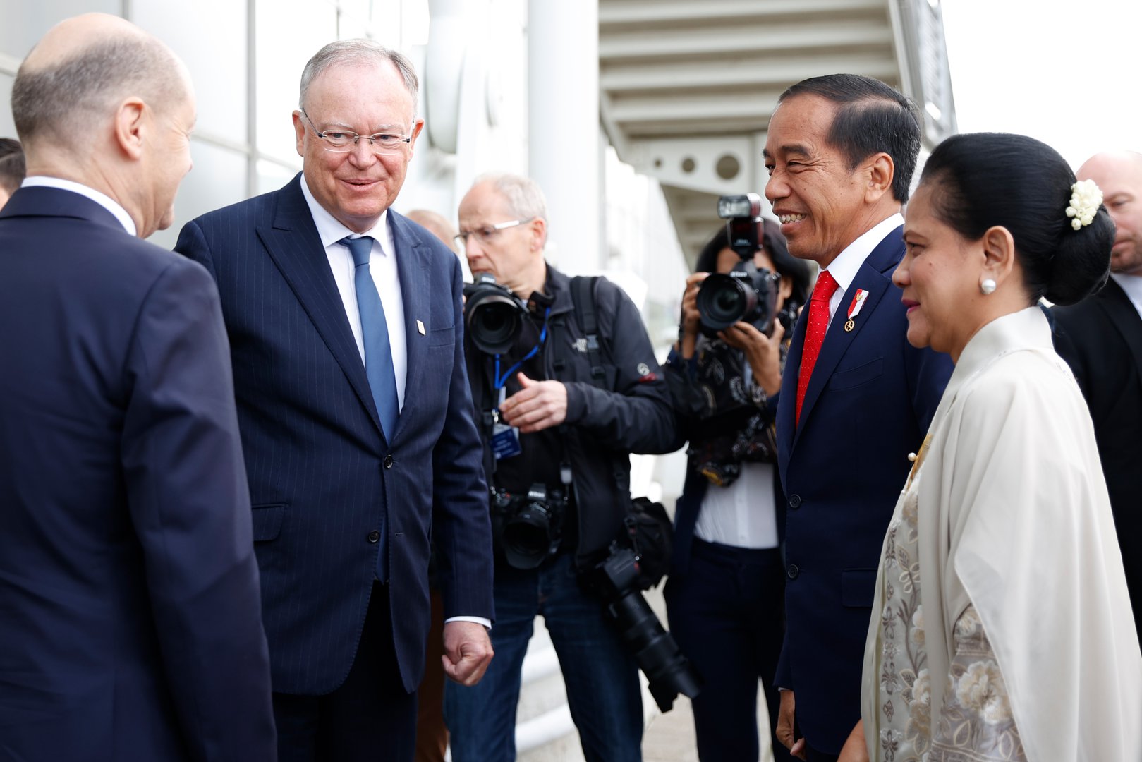 Bundeskanzler Olaf Scholz (links) und der niedersächsische Ministerpräsident Stephan Weil begrüßen am Montagmorgen den indonesischen Präsidenten Joko Widodo und seine Frau Iriana. dpa