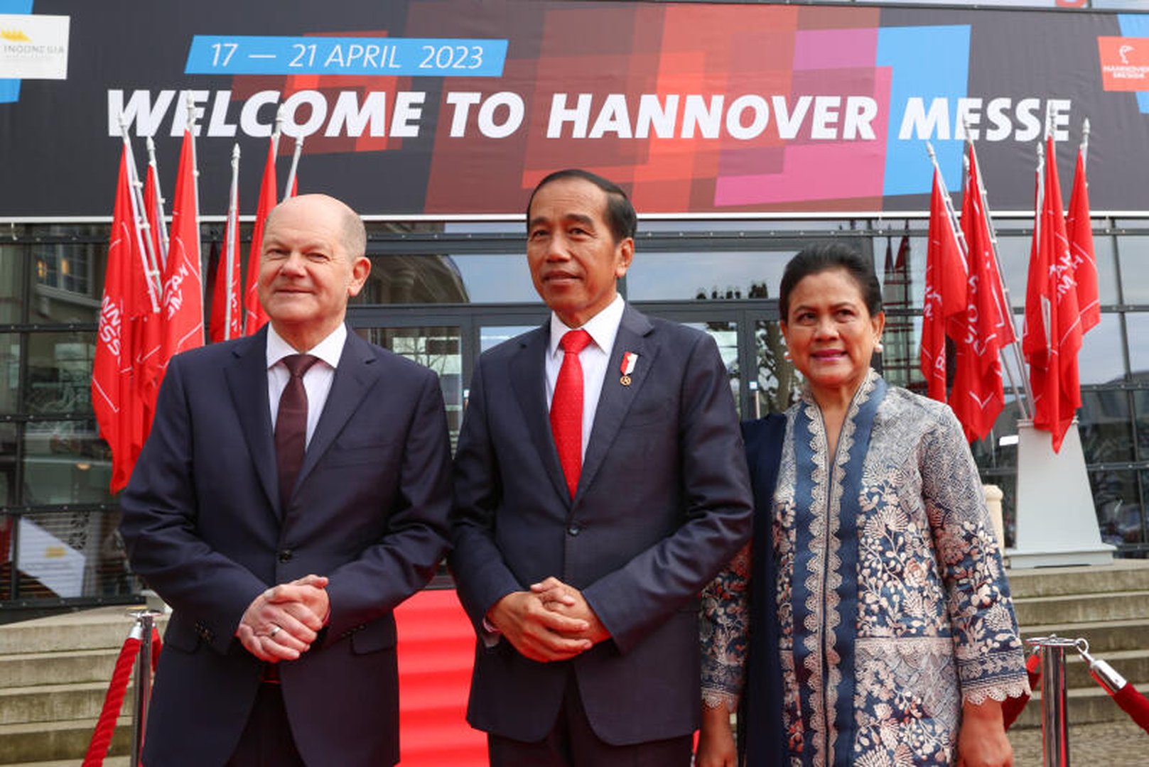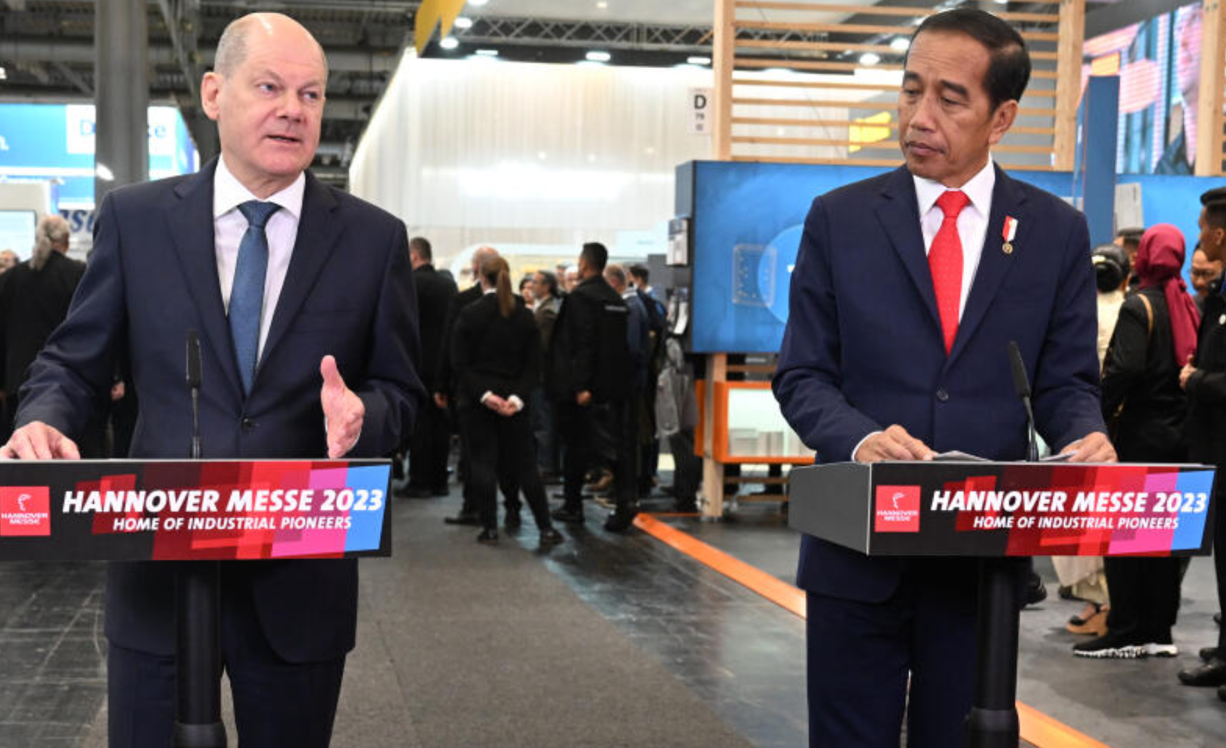 Bundeskanzler Olaf Scholz und Joko Widodo, Präsident von Indonesien, eröffnen auf der Industriemesse den Messetand des Partnerlandes Indonesien. Credit: dpa