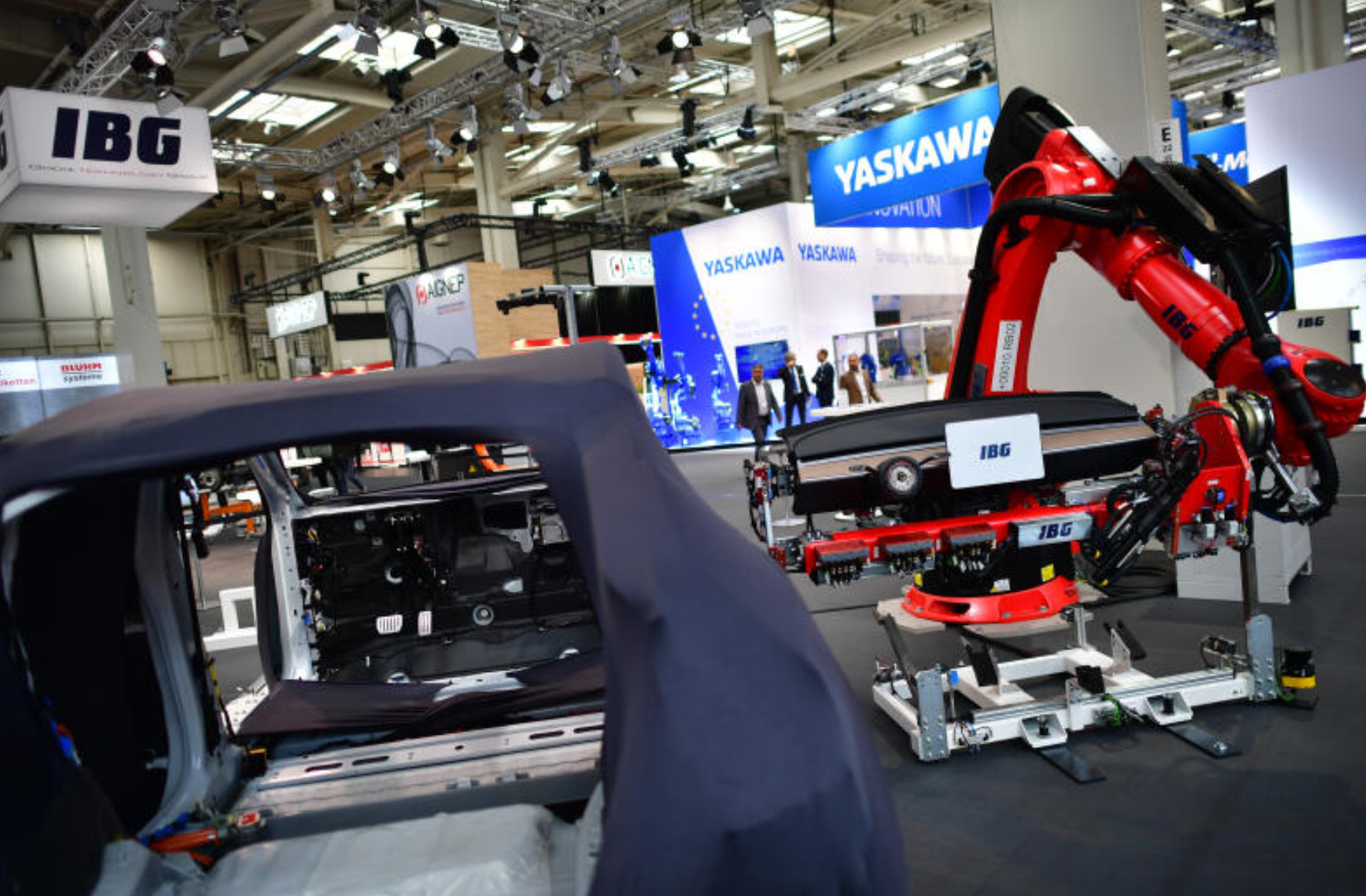 Ein pneumatischer Roboterarm baut Autokomponenten am Messestand von IBG auf. Credit: Getty Images