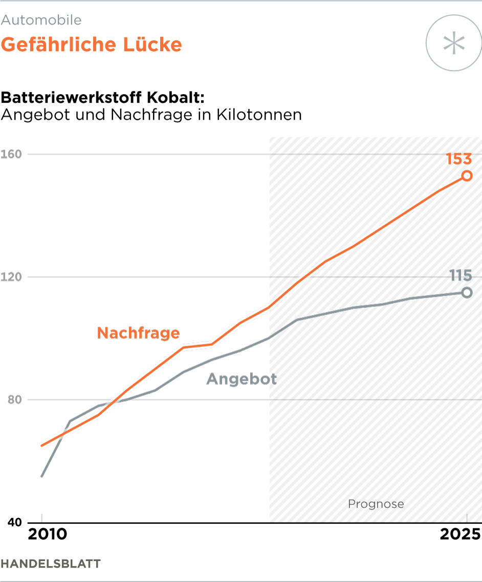 Kobalt gehört wie Wolfram und Zinn zu den 50 „Risikorohstoffen“, die Daimler für das Elektroauto identifiziert hat. Zehn Kilo des seltenen Erzes braucht man für jeden Elektroantrieb, bis 2025 will Daimler bis zu 500.000 Stromautos pro Jahr produzieren. 60 Prozent des heute geförderten Kobalts stammen aus dem Kongo, einem von Bürgerkriegen und Korruption gebeutelten Land.
