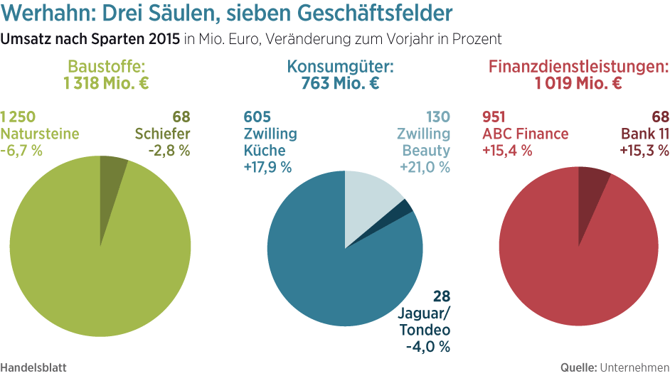 Zu verdanken hat der Clan den Wiederaufstieg einem beherzten Konzernumbau, verordnet von Vorstandschef Anton Werhahn, Nachfahre von Unternehmensgründer Wilhelm Werhahn in fünfter Generation. Mit den Geschäftsbanken Abcfinance und Bank11 wuchs Werhahn stetig, das unrentable Mühlengeschäft („Diamant-Mehl“) gaben die Neusser für 80 Millionen Euro ab. Den Verkaufserlös steckten sie 2015 in den Kauf des italienischen Besteckherstellers Ballarini, den sie ihrer Solinger Tochter Zwilling zuschlugen.