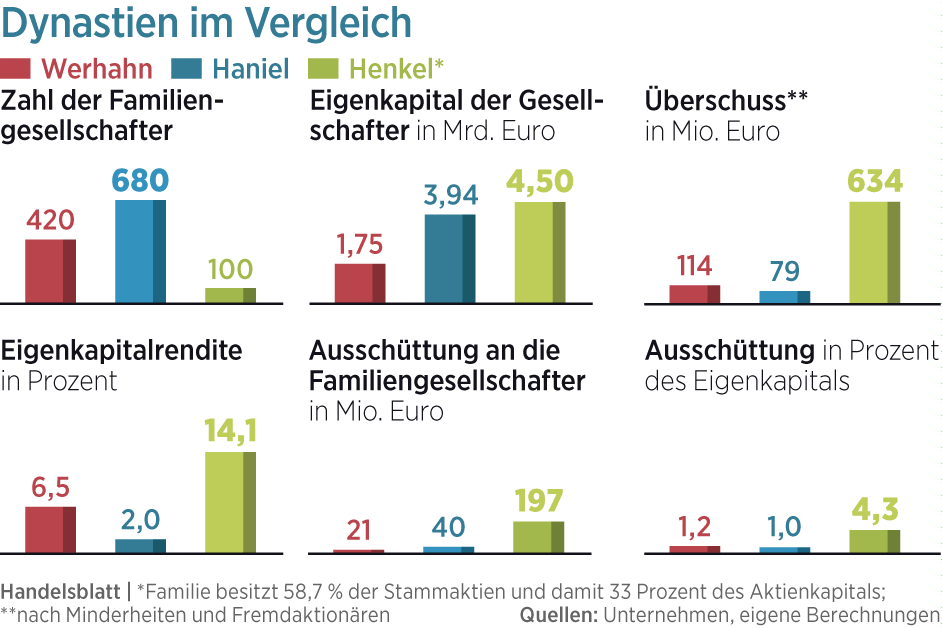 Mit dem Erfolg lassen die rund 420 Werhahn-Nachfahren den Haniel-Clan in Duisburg weit hinter sich. Hatte Haniel im Jahr zuvor noch durch außerordentliche Erlöse mithilfe von Unternehmensverkäufen geglänzt, mussten sich deren 680 Familiengesellschafter, geführt von Franz-Markus Haniel, 2015 mit einer Eigenkapitalrendite von zwei Prozent begnügen. Beim Umbau kommen die Duisburger nur zögerlich voran. Von den Milliardeneinnahmen aus dem Verkauf des Pharmagroßhändlers Celesio und Aktienpaketen von Metro hat Haniel bislang nur in den belgischen Matratzenbezugsspezialisten Bekeart investiert. Ein Unternehmen, das gerade einmal rund 200 Millionen Euro umsetzt.