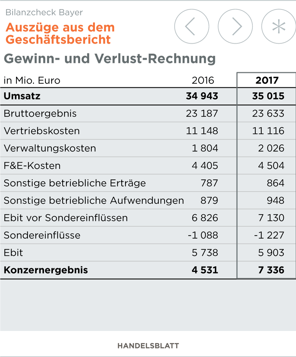 In der offiziellen Gewinnrechnung von Bayer wird die Übernahme von Monsanto zunächst wohl für einen heftigen Ergebnisrückgang sorgen. In der Proforma-Gewinn- und Verlustrechnung für 2017 weist der Konzern inklusive Monsanto bei 45 Milliarden Euro Umsatz ein Ebit von 4,8 Milliarden Euro und einen Nettogewinn aus fortgeführten Aktivitäten von nur rund 1,8 Milliarden Euro aus. Das vergleicht sich mit 5,9 Milliarden Euro Ebit und 3,2 Milliarden Euro Nettogewinn im Bayer-Abschluss für 2017 (ohne Monsanto).