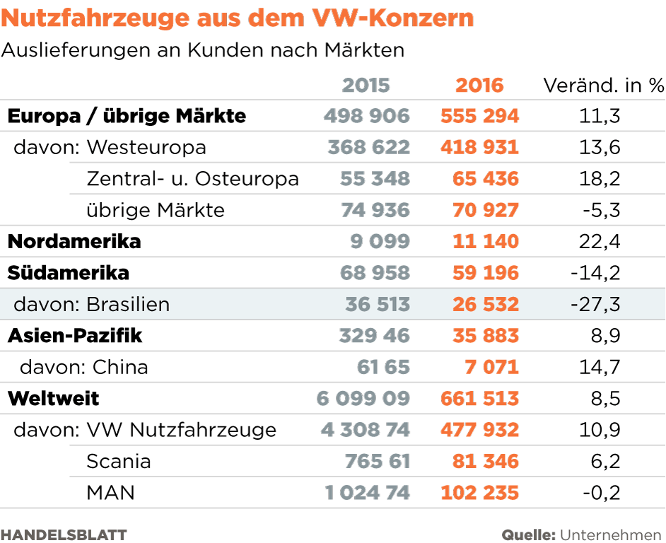 Der Grund für die schneller wachsende Nachfrage nach Kleinlastern ist der wachsende Konsum der Brasilianer in den Städten: Transporter bis 13 Tonnen Nutzlast werden dort als Lieferanten für den Einzelhandel, Restaurants und Shopping-Malls eingesetzt. Zudem boomen Zustell- und Paketdienste auch in Brasilien wegen des rasant wachsenden Internethandels. Großkunden wie Bergbaukonzerne und die Bauwirtschaft werden dagegen noch länger brauchen, bis sie schwere Trucks für ihre Flotten ordern. Auch staatliche Investitionen in der Infrastruktur kommen nur langsam vom Fleck. Die Verkäufe der großen Trucks dürften noch länger vor sich hindümpeln. Neue Dynamik verspricht allein das Einstiegssegment.