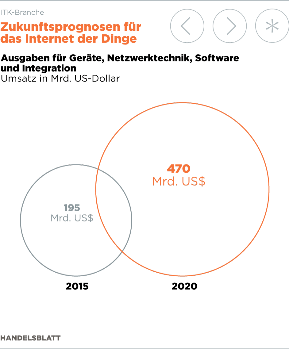 Die Telekom hat ein lukratives Geschäft ins Auge gefasst. Die Unternehmensberatung Bain & Company prognostiziert, dass der Markt für das Internet der Dinge bis 2020 jährlich zwischen 15 und 20 Prozent auf dann 470 Milliarden Dollar wächst. Die Vernetzung der Industrie, hierzulande unter dem Schlagwort Industrie 4.0 zusammengefasst, macht dabei 85 Milliarden Dollar aus.